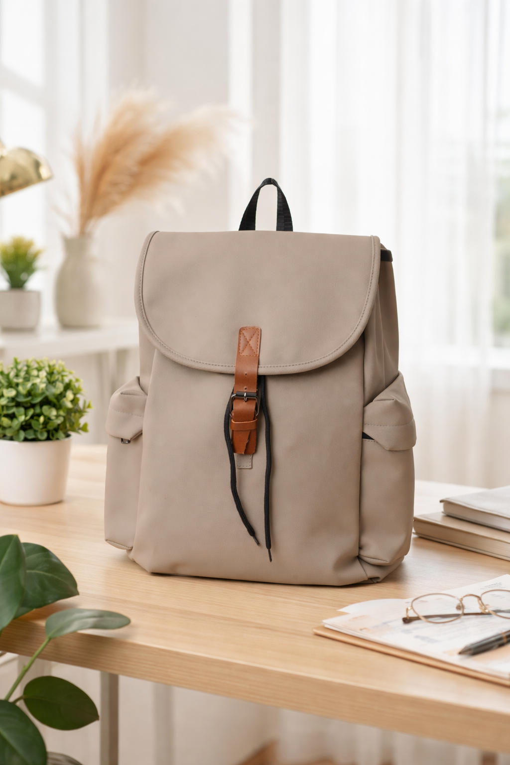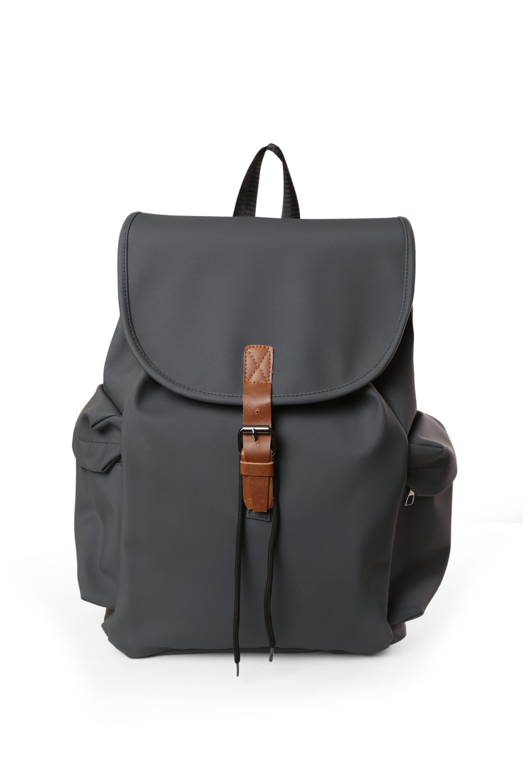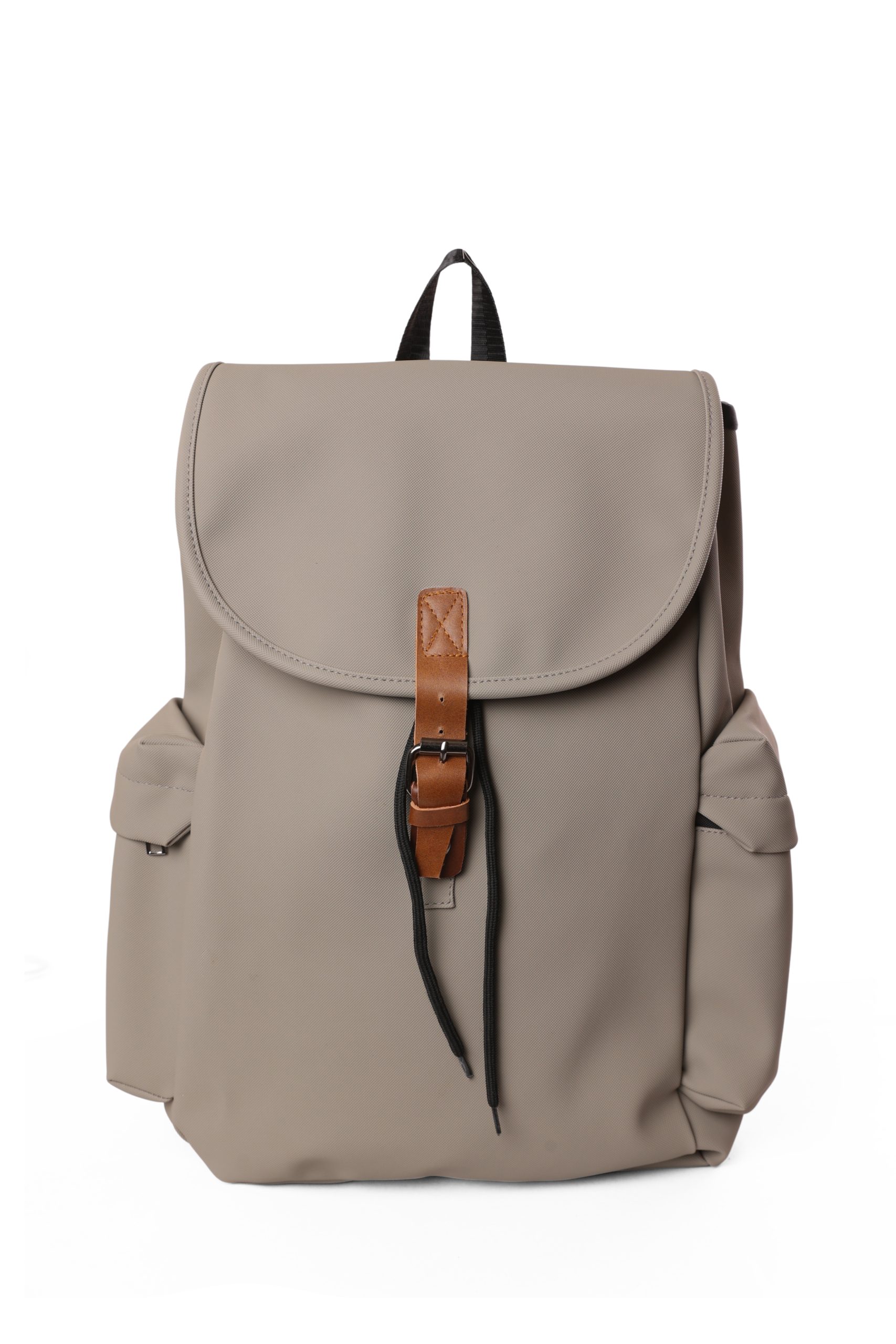 حقيبة ظهر كاجوال كبيرة بلون رمادى مع حزام جلدي أنيق وإغلاق بمشبك معدني يجمع بين الأناقة الكلاسيكية والوظائف العملية